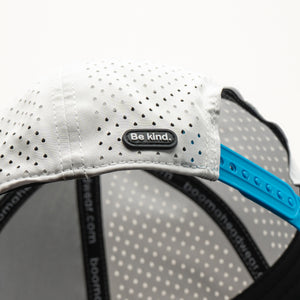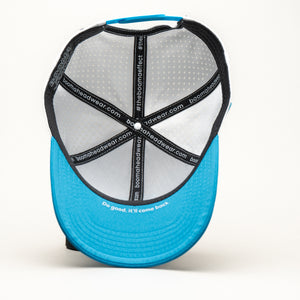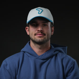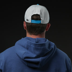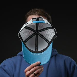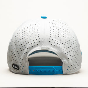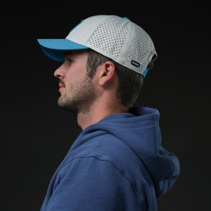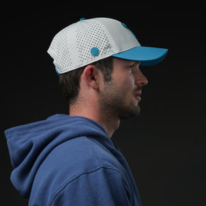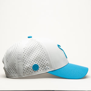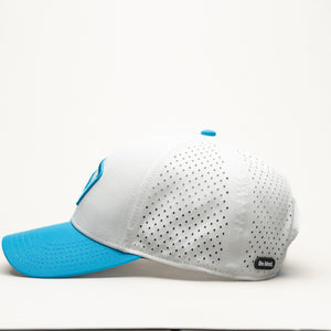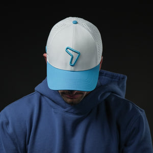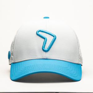 Dive into effortless style with the Aqua Flow Cap. This refreshing hat features a crisp white crown complemented by a vibrant aqua blue brim and a matching embroidered emblem. Designed for ultimate comfort and breathability, it's the perfect accessory for a sunny day on the golf course, a brisk walk, or simply adding a cool touch to your everyday look. The unique symbol adds a dynamic edge, making it a standout piece.