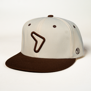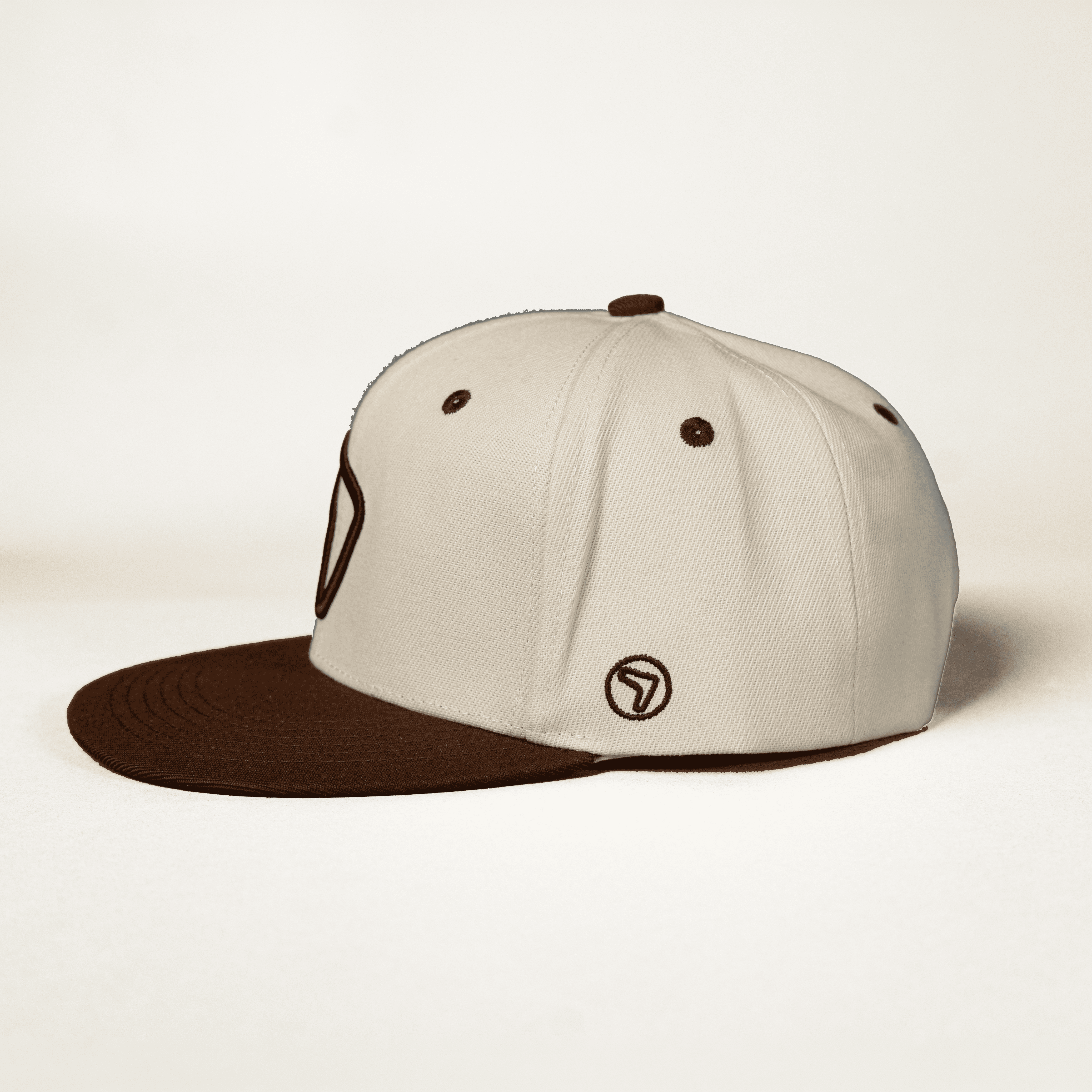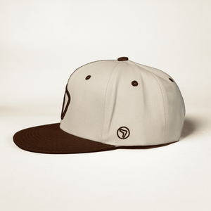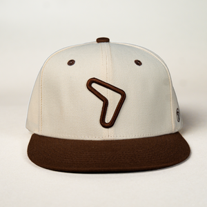 A clean cream crown with a rich brown flat brim for a refined, everyday look. Finished with a raised Booma logo and matching top button detail, this cap brings depth and texture to a classic silhouette.